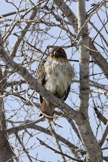 Today we headed out hoping to see birds of prey. Almost immediately we spotted a Cooper's Hawk along the highway. Woo Hoo! Off to a great start! Although we didn't count the number of Red-Tailed Hawks, it seemed like there were hundreds (one of which stayed still long enough to gake a pretty decent picture). Both of us were spotting RT Hawks left and right. One of the times I spotted a hawk soaring up high to the left of the highway. It only took a second to realize it had a dark tail band, dark "knuckles," and windows on the wings. I'm glad there wasn't much traffic because I'm sure I drifted into the other lane while gazing out the window. :) A quick check with the guide confirmed a Rough-legged Hawk. Excellent! A Lifer!